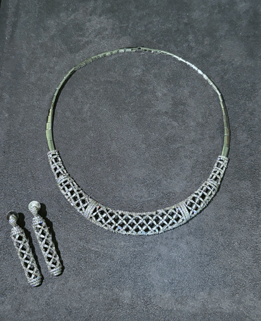 Presenting Windsor, a striking jewelry set that embodies regal elegance and timeless craftsmanship. The necklace and earrings feature an intricate cage-like design, evoking the strength and sophistication of classic architecture. Delicately woven metal frames enclose radiant gemstones, creating a mesmerizing interplay of light and shadow. The Windsor collection blends bold structure with refined beauty, offering a sense of opulence and grace. The necklace and earrings exude an air of majesty and grandeur, making it a perfect choice for those who seek to wear both power and poise in every detail.
